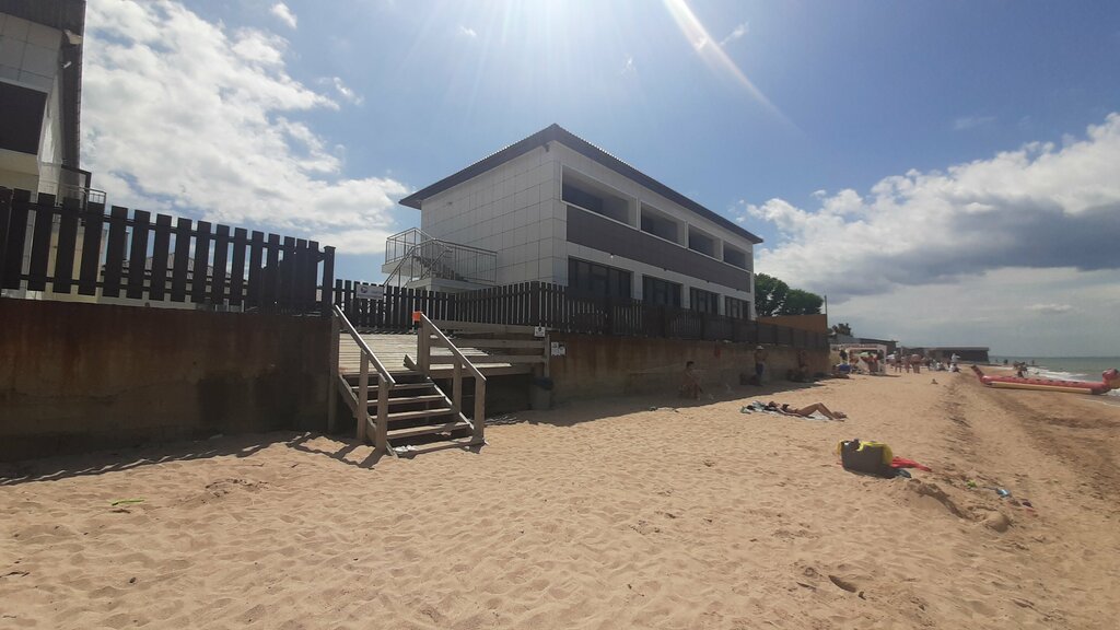 Отличный вариант для семейного отдыха с детьми! Отель расположен прямо на берегу Азовского моря. На территории отеля-бассейн с выделенной зоной для детского купания. Достаточное количество зонтов и шезлонгов. Для детей есть батут и игровая горка. Можно отдохнуть в уютных беседка, рядом с которыми мангал. В шаговой доступности есть кафе, столовые, на территории отеля бар.