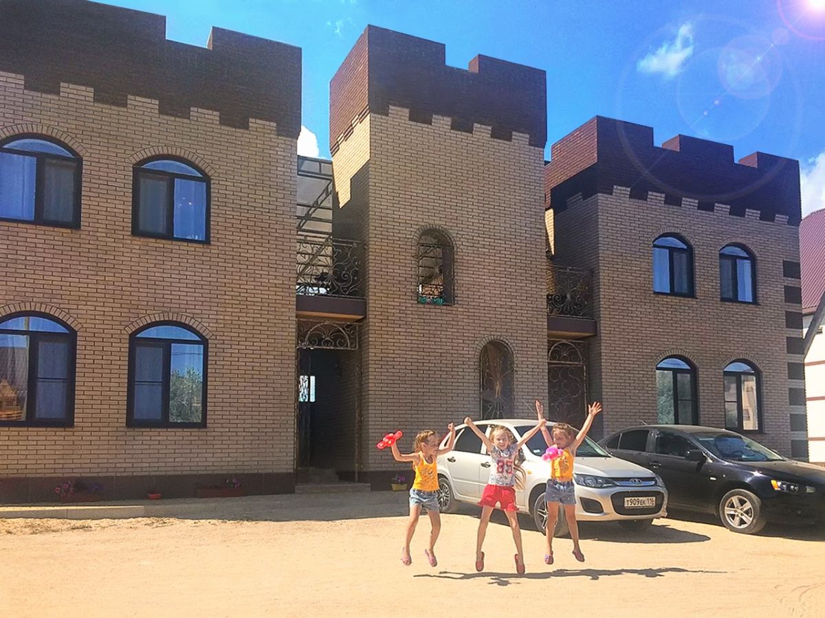 Гостевой дом действительно похож на замок. В центре дома большой зал, вокруг расположены небольшие но уютные номера. С боку лестница на второй этаж, а там и открытая терраса с мангалом и видом на соседние крыши. До моря пешком 7-10 минут, рядом столовая. Море в этом месте чистое , берег крупный песок ( ракушечник) Хозяева приветливые заботливые адекватные люди